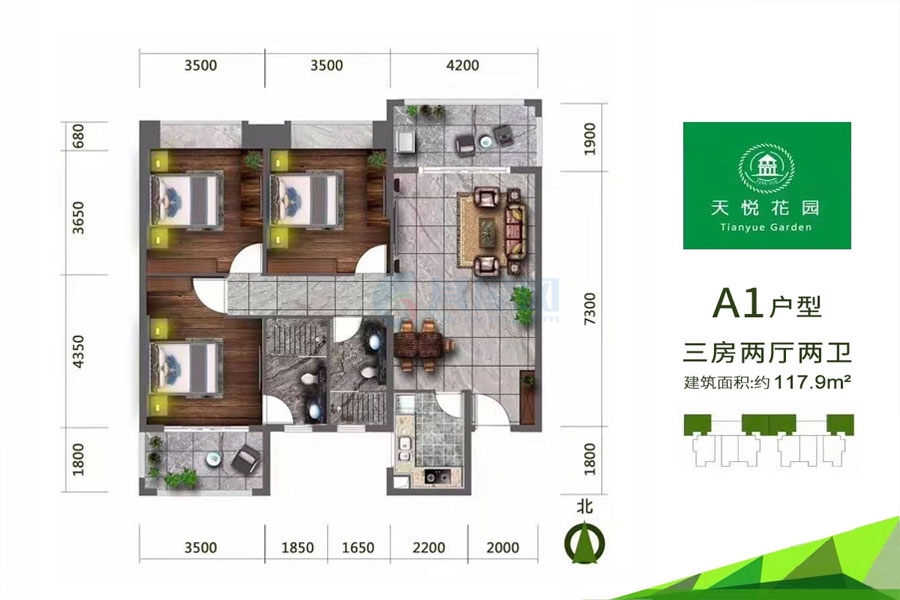 A1户型-建面约117.9平-三房两厅两卫(建筑面积:117.9㎡)