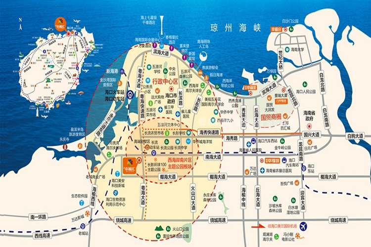 项目沿海而建且北邻琼州海峡东临文澜江。琼州海峡的内海湾是稀少的天然滨海浴场,海岸线往外200内海域水深不足两米,浅滩可游泳让你零距离接触一线原生滨海景观,滨海风情生活轻松享。