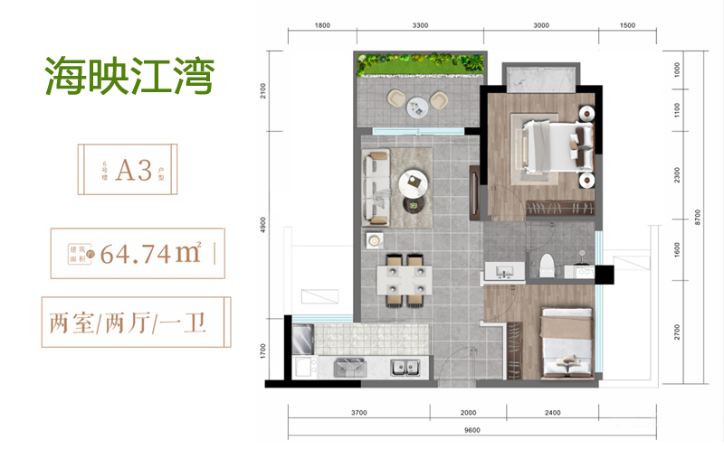 海映江湾A3户型两房两厅建面64平米(建筑面积:㎡)