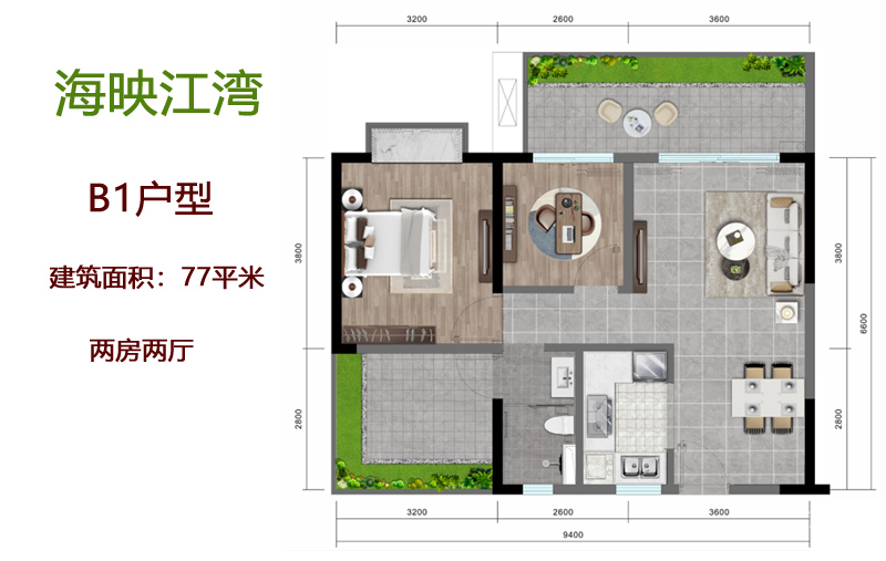 海映江湾B1户型两房两厅建面77平米(建筑面积:㎡)