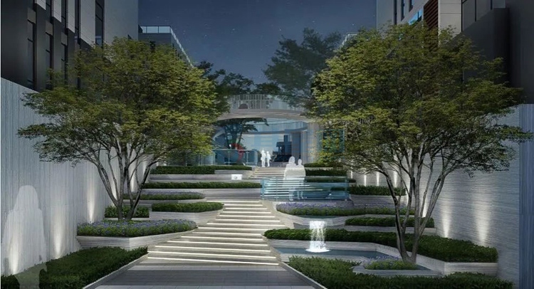 利用时尚建筑室外景观环境,营造阳光草坪、生态休闲广场洽谈区、灌木绿植景观、叠级水景花池,辅以商业街区特色艺术铺装的结合,打造儋州全新生态园区商务广场地标。