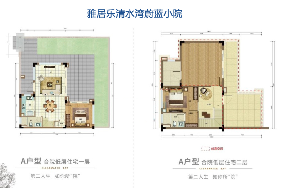 雅居乐清水湾蔚蓝小院建面为103.42-105.58平米三房户型,一次性总价604-736万/套