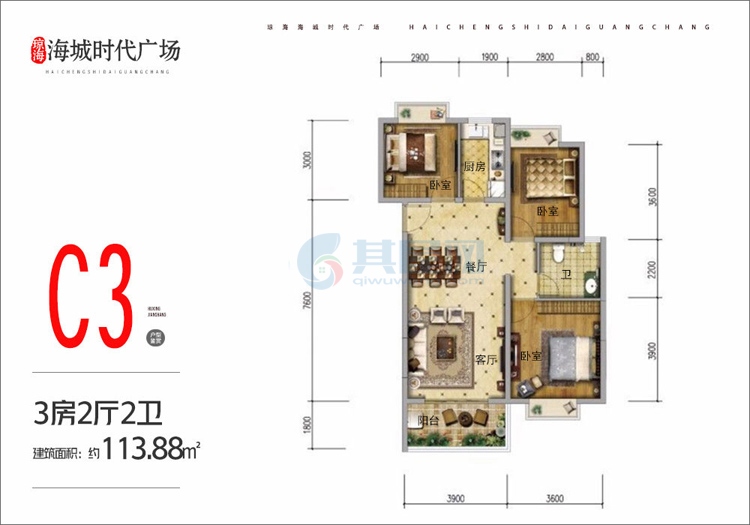 C3户型-建面约113.88㎡-3房2厅2卫