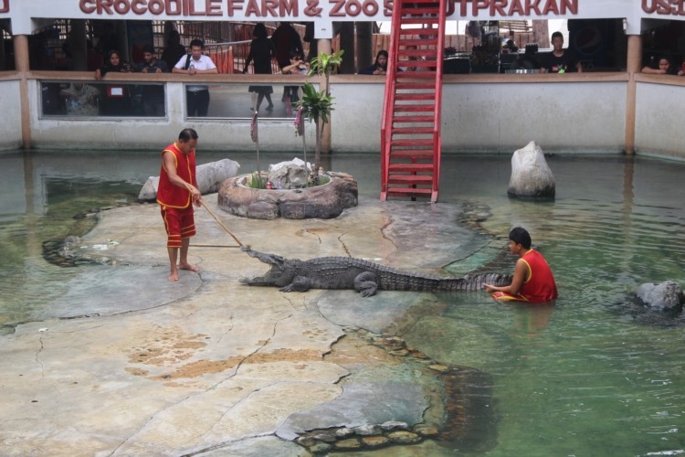 下一站是鳄鱼湖,鳄鱼湖距离曼谷约10公里,位于曼谷东南方。入口处是一座尖顶重檐的泰式建筑,上方书有3种文字。在鳄鱼湖内,小伙伴们欣赏了泰国精彩的鳄鱼表演,也观赏到来自世界各地的各种鳄鱼,其中有大的鳄鱼,重达1100多公斤,长达6米多。